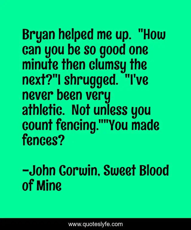 This page presents the quote "Bryan helped me up. "How can you be so good one minute then clumsy the next?"I shrugged. "I've never been very athletic. Not unless you count fencing.""You made fences?". Author of this quote is John Corwin, Sweet Blood of Mine. This quote is about funny, john-corwin, stupid, sweet-blood-of-mine, comedy, fences,.