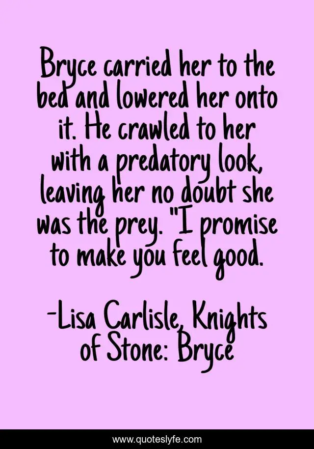 This page presents the quote "Bryce carried her to the bed and lowered her onto it. He crawled to her with a predatory look, leaving her no doubt she was the prey. "I promise to make you feel good.". Author of this quote is Lisa Carlisle, Knights of Stone: Bryce. This quote is about gargoyle-romance, paranormal-romance,.