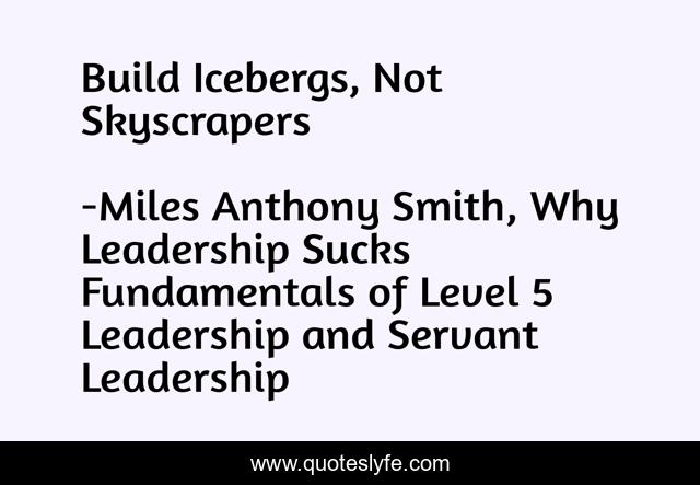 "Miles Anthony Smith, Why Leadership Sucks™ Fundamentals of Level 5 Leadership and Servant Leadership Quotes." Quoteslyfe.com, 2025. Fri. 05 Dec. 2025. <https://www.quoteslyfe.com/quote/Build-Icebergs-Not-Skyscrapers-194308>.