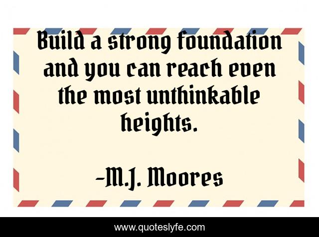 This page presents the quote "Build a strong foundation and you can reach even the most unthinkable heights.". Author of this quote is M.J. Moores. This quote is about strength, goal-setting, writing-process,.