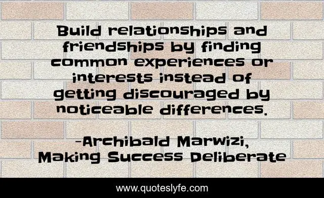 This page presents the quote "Build relationships and friendships by finding common experiences or interests instead of getting discouraged by noticeable differences.". Author of this quote is Archibald Marwizi, Making Success Deliberate. This quote is about life, success, behaviour, attitude, legacy, growth, purpose, inspirational, leadership,.