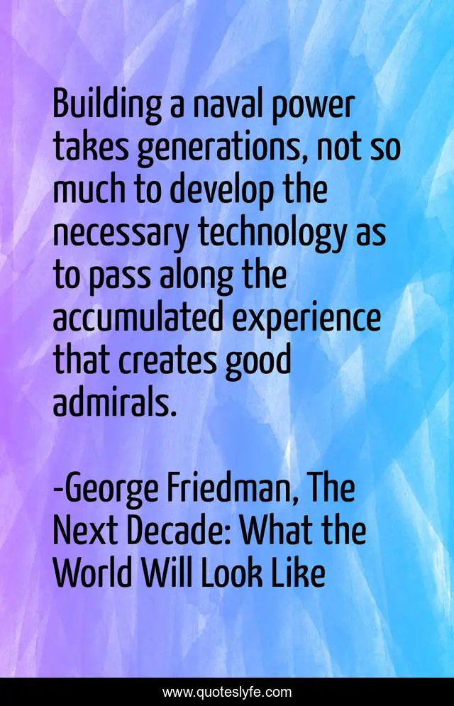 This page presents the quote "Building a naval power takes generations, not so much to develop the necessary technology as to pass along the accumulated experience that creates good admirals.". Author of this quote is George Friedman, The Next Decade: What the World Will Look Like. This quote is about culture, education, expectations, heritage,.