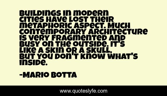 This page presents the quote "Buildings in modern cities have lost their metaphoric aspect. Much contemporary architecture is very fragmented and busy on the outside. It's like a skin or a skull, but you don't know what's inside.". Author of this quote is Mario Botta. This quote is about busy, lost,.