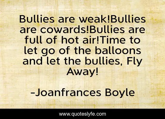 This page presents the quote "Bullies are weak!Bullies are cowards!Bullies are full of hot air!Time to let go of the balloons and let the bullies, Fly Away!". Author of this quote is Joanfrances Boyle. This quote is about inner-strength, enthusiasm, bulling, inspirational,.