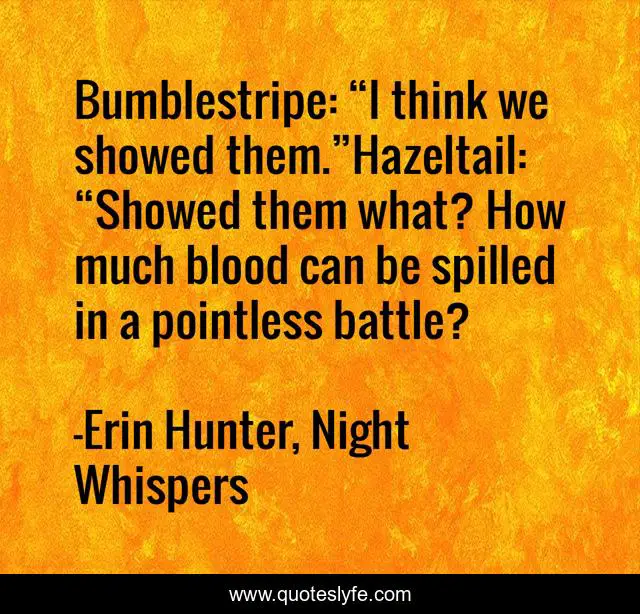This page presents the quote "Bumblestripe: “I think we showed them.”Hazeltail: “Showed them what? How much blood can be spilled in a pointless battle?". Author of this quote is Erin Hunter, Night Whispers. This quote is about warrior-cats, blood, war,.