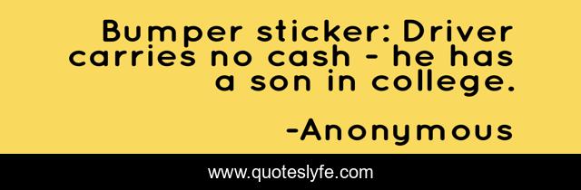This page presents the quote "Bumper sticker: Driver carries no cash - he has a son in college.". Author of this quote is Anonymous. .
