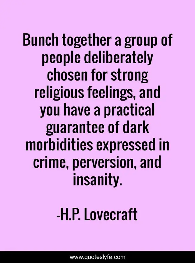 This page presents the quote "Bunch together a group of people deliberately chosen for strong religious feelings, and you have a practical guarantee of dark morbidities expressed in crime, perversion, and insanity.". Author of this quote is H.P. Lovecraft. This quote is about horror, cthulhu, mythos, lovecraft,.