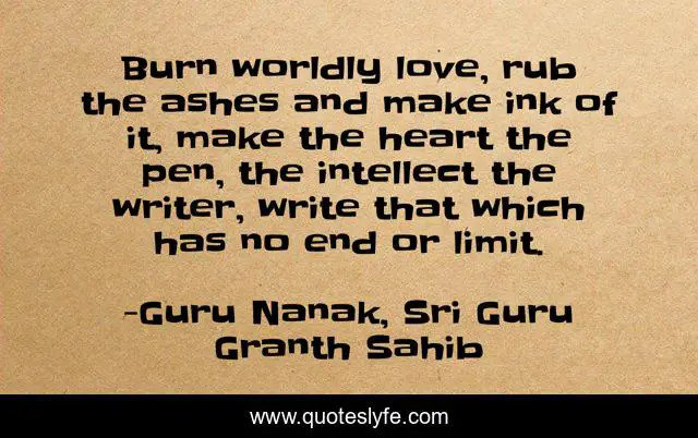 This page presents the quote "Burn worldly love, rub the ashes and make ink of it, make the heart the pen, the intellect the writer, write that which has no end or limit.". Author of this quote is Guru Nanak, Sri Guru Granth Sahib. This quote is about knowledge, spiritual, wisdom, intellect, writing,.