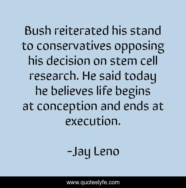 This page presents the quote "Bush reiterated his stand to conservatives opposing his decision on stem cell research. He said today he believes life begins at conception and ends at execution.". Author of this quote is Jay Leno. This quote is about life, decision, today,.