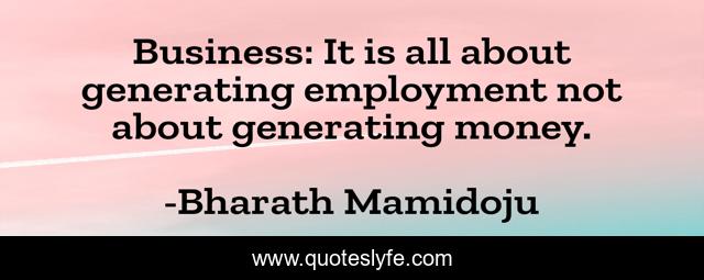 This page presents the quote "Business: It is all about generating employment not about generating money.". Author of this quote is Bharath Mamidoju. This quote is about money, business-culture, employment,.