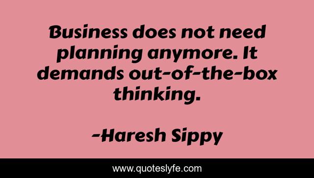 This page presents the quote "Business does not need planning anymore. It demands out-of-the-box thinking.". Author of this quote is Haresh Sippy. .