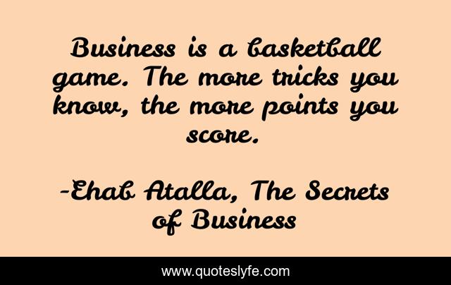 This page presents the quote "Business is a basketball game. The more tricks you know, the more points you score.". Author of this quote is Ehab Atalla, The Secrets of Business. This quote is about skills, business, entrepreneurship,.