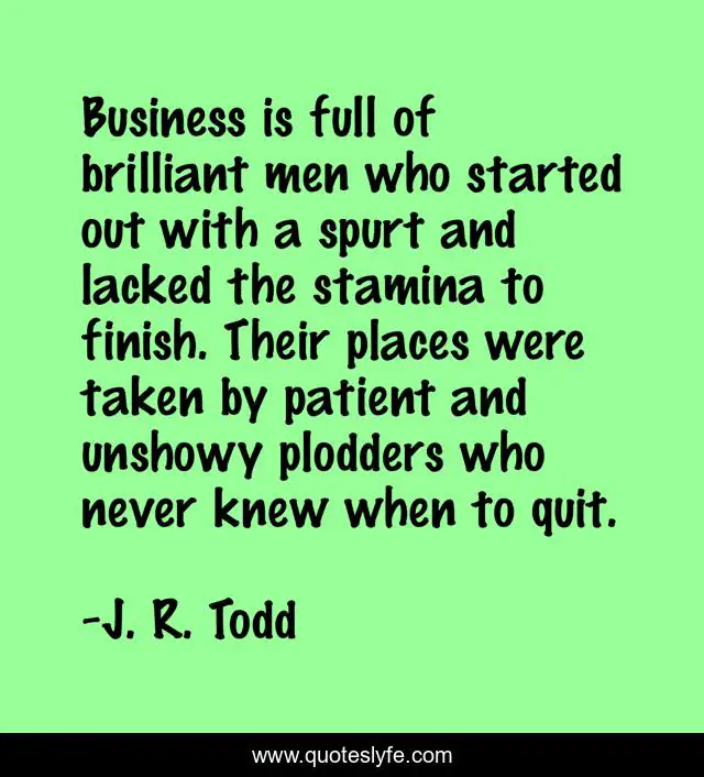 This page presents the quote "Business is full of brilliant men who started out with a spurt and lacked the stamina to finish. Their places were taken by patient and unshowy plodders who never knew when to quit.". Author of this quote is J. R. Todd. This quote is about , pressure, diamonds,.