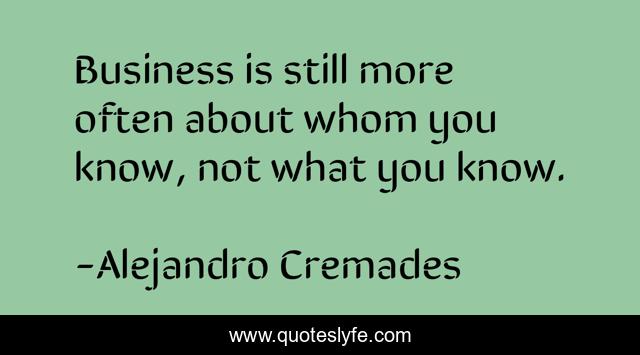 This page presents the quote "Business is still more often about whom you know, not what you know.". Author of this quote is Alejandro Cremades. This quote is about startup-fundraising, entrepreneurship-training, finance, startup-training, entrepreneurs-institute, start-up, startup, entrepreneurship, entrepreneur,.