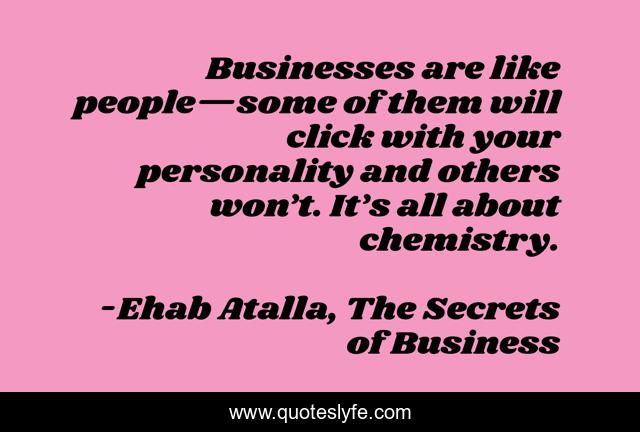 This page presents the quote "Businesses are like people—some of them will click with your personality and others won’t. It’s all about chemistry.". Author of this quote is Ehab Atalla, The Secrets of Business. This quote is about entrepreneur, business, entrepreneurship,.