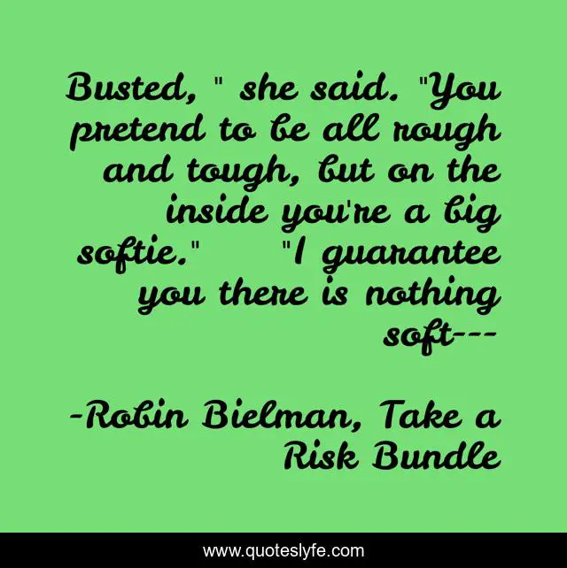 This page presents the quote "Busted, " she said. "You pretend to be all rough and tough, but on the inside you're a big softie." "I guarantee you there is nothing soft---". Author of this quote is Robin Bielman, Take a Risk Bundle. This quote is about conservation, contemporary-romance, navy-seal-romance,.