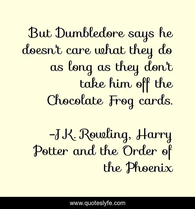 This page presents the quote "But Dumbledore says he doesn't care what they do as long as they don't take him off the Chocolate Frog cards.". Author of this quote is J.K. Rowling, Harry Potter and the Order of the Phoenix. This quote is about funny, celebrity, comedy, fame, dumbledore,.