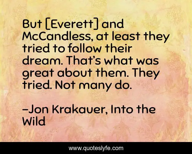 This page presents the quote "But [Everett] and McCandless, at least they tried to follow their dream. That’s what was great about them. They tried. Not many do.". Author of this quote is Jon Krakauer, Into the Wild. This quote is about into-the-wild, enthusiasm, dreams, inspirational,.