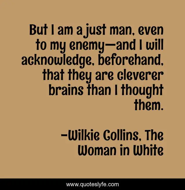 This page presents the quote "But I am a just man, even to my enemy—and I will acknowledge, beforehand, that they are cleverer brains than I thought them.". Author of this quote is Wilkie Collins, The Woman in White. This quote is about enemy, clever, smarts, adversaries, acknowledgement, brains, acknowledge, beforehand, enemies,.
