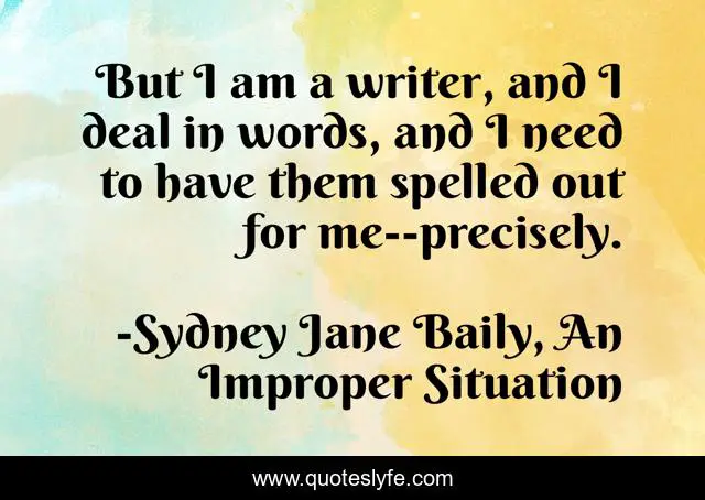 This page presents the quote "But I am a writer, and I deal in words, and I need to have them spelled out for me--precisely.". Author of this quote is Sydney Jane Baily, An Improper Situation. .