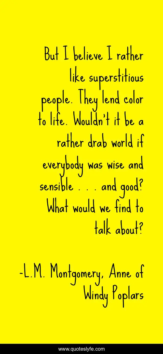 This page presents the quote "But I believe I rather like superstitious people. They lend color to life. Wouldn't it be a rather drab world if everybody was wise and sensible . . . and good? What would we find to talk about?". Author of this quote is L.M. Montgomery, Anne of Windy Poplars. This quote is about world, green-gables, talk,.