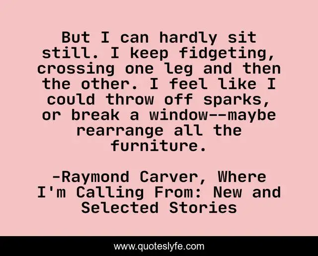This page presents the quote "But I can hardly sit still. I keep fidgeting, crossing one leg and then the other. I feel like I could throw off sparks, or break a window--maybe rearrange all the furniture.". Author of this quote is Raymond Carver, Where I'm Calling From: New and Selected Stories. This quote is about crazy, anxiety, fireworks, life, excitement, hyper, wild,.