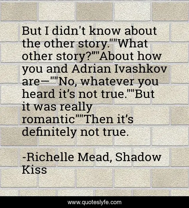 This page presents the quote "But I didn't know about the other story.""What other story?”"About how you and Adrian Ivashkov are—""No, whatever you heard it’s not true.""But it was really romantic""Then it’s definitely not true.". Author of this quote is Richelle Mead, Shadow Kiss. This quote is about academy, jill, vampire, jillian, rose,.