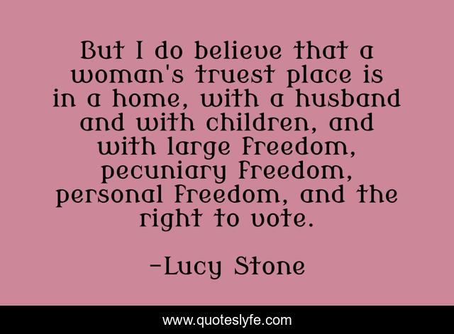 This page presents the quote "But I do believe that a woman's truest place is in a home, with a husband and with children, and with large freedom, pecuniary freedom, personal freedom, and the right to vote.". Author of this quote is Lucy Stone. This quote is about freedom, woman, children,.