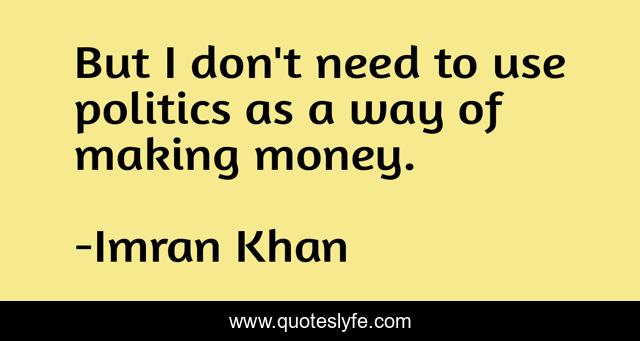 This page presents the quote "But I don't need to use politics as a way of making money.". Author of this quote is Imran Khan. This quote is about money, making money, way,.