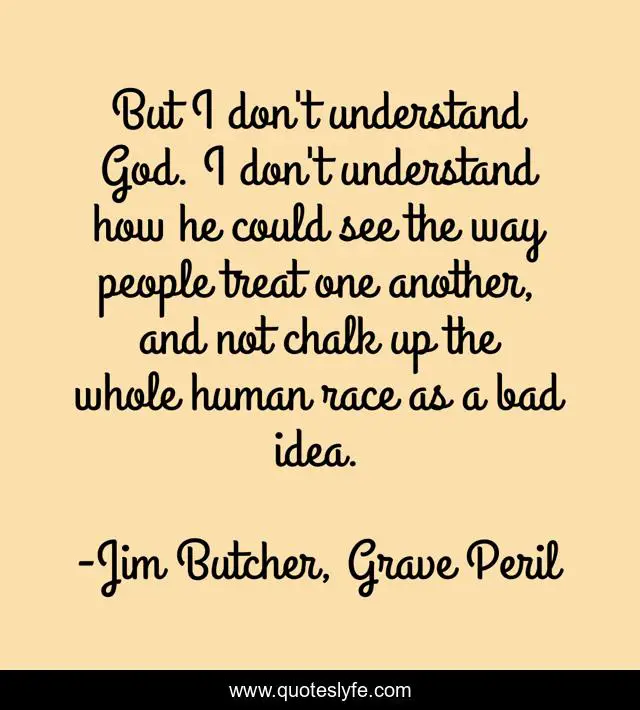 This page presents the quote "But I don't understand God. I don't understand how he could see the way people treat one another, and not chalk up the whole human race as a bad idea.". Author of this quote is Jim Butcher, Grave Peril. This quote is about god, grave-peril, human-race, harry-dresden,.