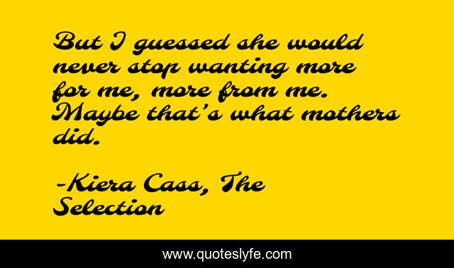 This page presents the quote "But I guessed she would never stop wanting more for me, more from me. Maybe that’s what mothers did.". Author of this quote is Kiera Cass, The Selection. .