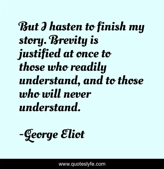 This page presents the quote "But I hasten to finish my story. Brevity is justified at once to those who readily understand, and to those who will never understand.". Author of this quote is George Eliot. This quote is about brevity-of-words, storytelling,.