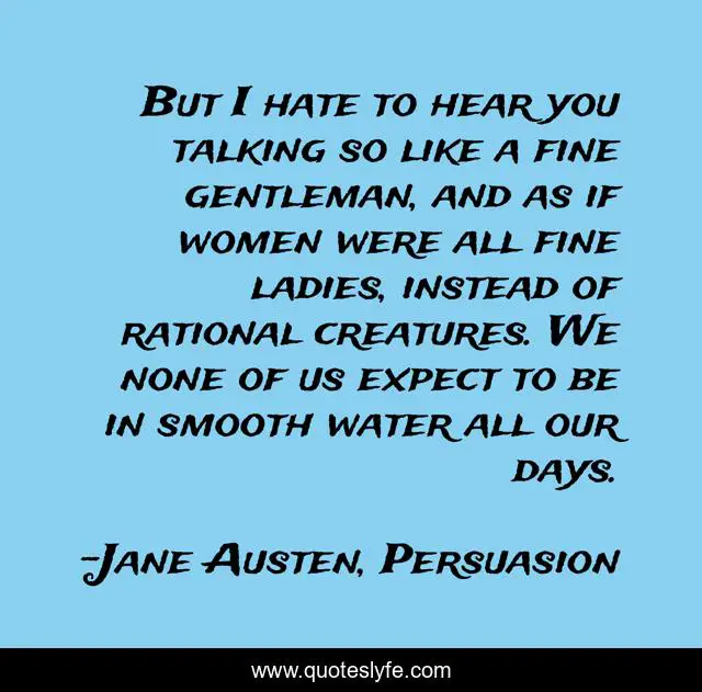This page presents the quote "But I hate to hear you talking so like a fine gentleman, and as if women were all fine ladies, instead of rational creatures. We none of us expect to be in smooth water all our days.". Author of this quote is Jane Austen, Persuasion. This quote is about romance, classics, literature,.