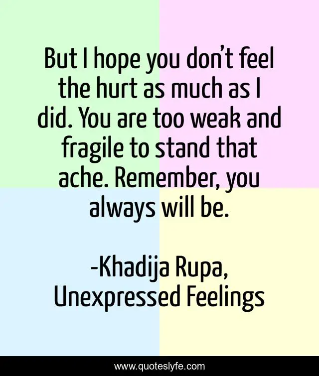 This page presents the quote "But I hope you don’t feel the hurt as much as I did. You are too weak and fragile to stand that ache. Remember, you always will be.". Author of this quote is Khadija Rupa, Unexpressed Feelings. This quote is about khadija-rupa, remember, weakness, fragile, hopeful, unexpressed-feelings, hurt, sad-poetry, lessons-in-life,.