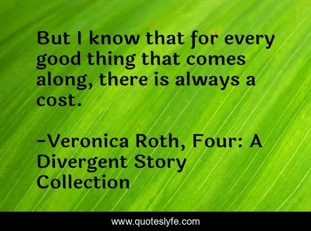 This page presents the quote "But I know that for every good thing that comes along, there is always a cost.". Author of this quote is Veronica Roth, Four: A Divergent Story Collection. This quote is about life, death, love, truth, dauntless, people, inspirational, loneliness, four,.