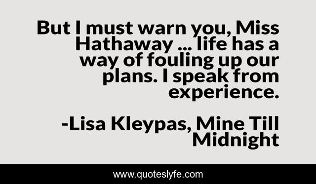 This page presents the quote "But I must warn you, Miss Hathaway ... life has a way of fouling up our plans. I speak from experience.". Author of this quote is Lisa Kleypas, Mine Till Midnight. This quote is about fouling, hathaways, plans, fate, lisa-kleypas,.