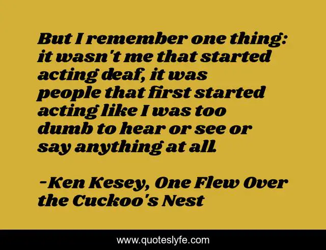 This page presents the quote "But I remember one thing: it wasn't me that started acting deaf, it was people that first started acting like I was too dumb to hear or see or say anything at all.". Author of this quote is Ken Kesey, One Flew Over the Cuckoo's Nest. This quote is about reality-of-life, observation, psychology,.