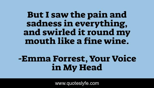 This page presents the quote "But I saw the pain and sadness in everything, and swirled it round my mouth like a fine wine.". Author of this quote is Emma Forrest, Your Voice in My Head. This quote is about life, pain, sorrow, depression,.