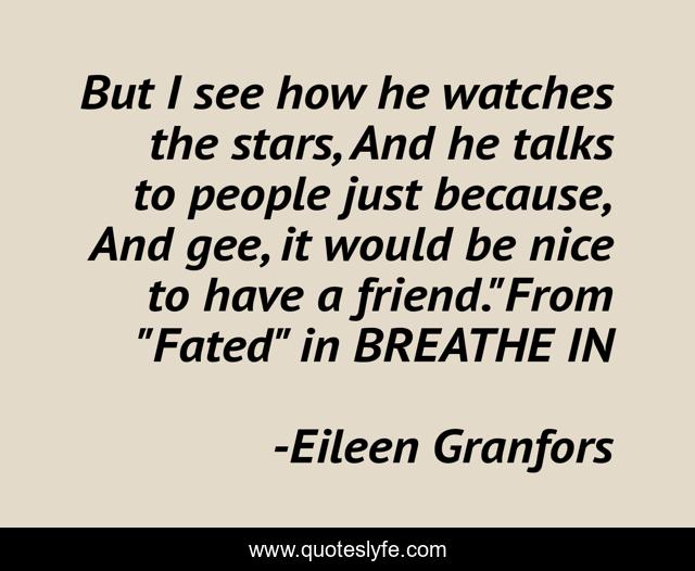 This page presents the quote "But I see how he watches the stars, And he talks to people just because, And gee, it would be nice to have a friend."From "Fated" in BREATHE IN". Author of this quote is Eileen Granfors. This quote is about divorce, friends-and-lovers, new-romance,.