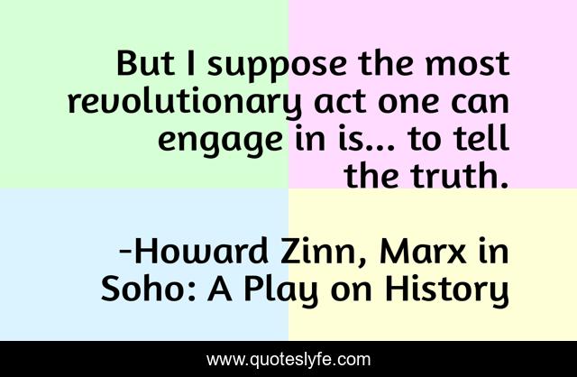 This page presents the quote "But I suppose the most revolutionary act one can engage in is... to tell the truth.". Author of this quote is Howard Zinn, Marx in Soho: A Play on History. This quote is about revolution, truth-telling,.