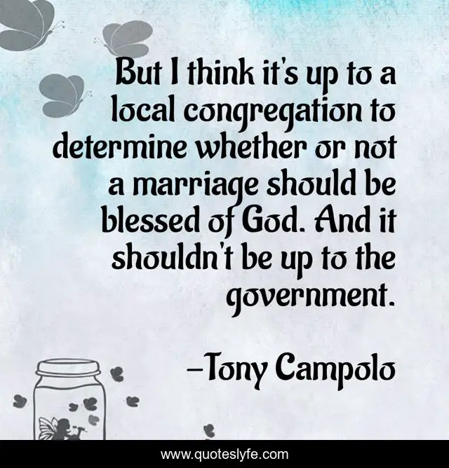 This page presents the quote "But I think it's up to a local congregation to determine whether or not a marriage should be blessed of God. And it shouldn't be up to the government.". Author of this quote is Tony Campolo. This quote is about god, blessed, government,.