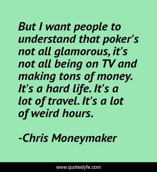 This page presents the quote "But I want people to understand that poker's not all glamorous, it's not all being on TV and making tons of money. It's a hard life. It's a lot of travel. It's a lot of weird hours.". Author of this quote is Chris Moneymaker. This quote is about money, life, people,.