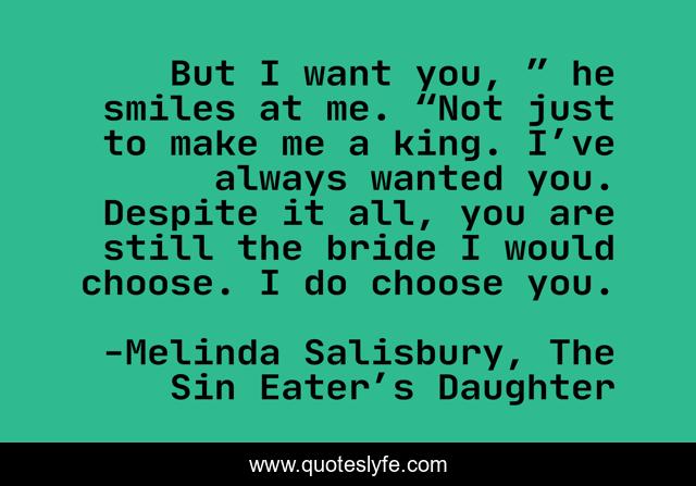 This page presents the quote "But I want you, ” he smiles at me. “Not just to make me a king. I’ve always wanted you. Despite it all, you are still the bride I would choose. I do choose you.". Author of this quote is Melinda Salisbury, The Sin Eater’s Daughter. .