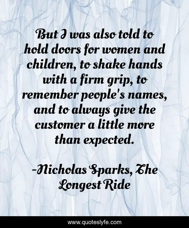 This page presents the quote "But I was also told to hold doors for women and children, to shake hands with a firm grip, to remember people's names, and to always give the customer a little more than expected.". Author of this quote is Nicholas Sparks, The Longest Ride. This quote is about love, sparks, movie, ride, nicholassparks, romace, famous, book, longest,.