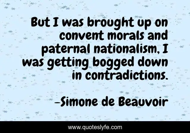 This page presents the quote "But I was brought up on convent morals and paternal nationalism, I was getting bogged down in contradictions.". Author of this quote is Simone de Beauvoir. This quote is about politics, nationalism, upbringing, religion,.
