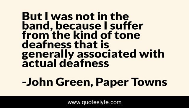 This page presents the quote "But I was not in the band, because I suffer from the kind of tone deafness that is generally associated with actual deafness". Author of this quote is John Green, Paper Towns. This quote is about humor, music,.