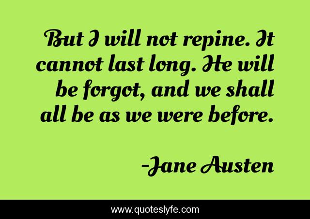 This page presents the quote "But I will not repine. It cannot last long. He will be forgot, and we shall all be as we were before.". Author of this quote is Jane Austen. This quote is about heartache, heartbreak, resilience,.