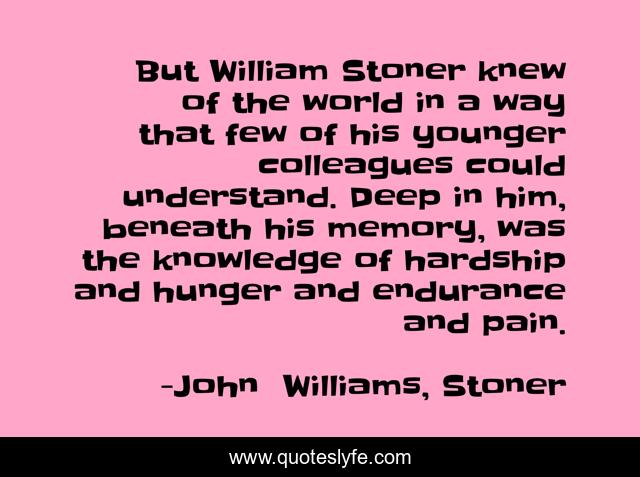 This page presents the quote "But William Stoner knew of the world in a way that few of his younger colleagues could understand. Deep in him, beneath his memory, was the knowledge of hardship and hunger and endurance and pain.". Author of this quote is John Williams, Stoner. This quote is about endurance, pain, hardship, hunger,.