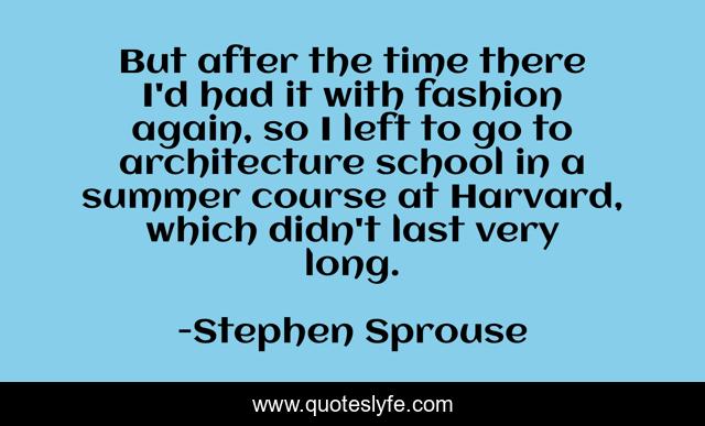 This page presents the quote "But after the time there I'd had it with fashion again, so I left to go to architecture school in a summer course at Harvard, which didn't last very long.". Author of this quote is Stephen Sprouse. This quote is about school, fashion, time,.