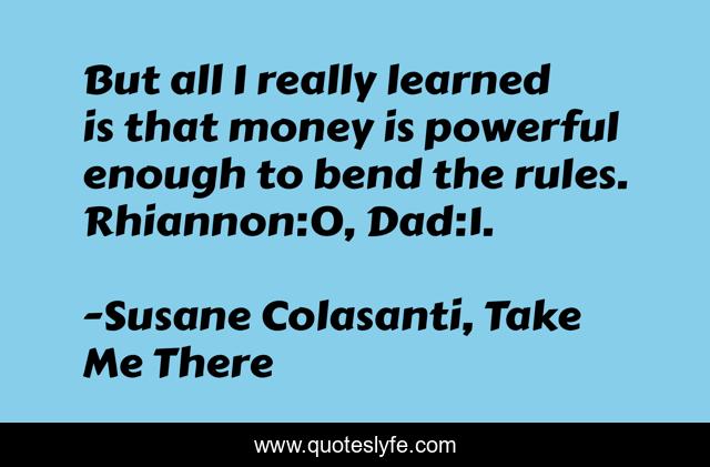 This page presents the quote "But all I really learned is that money is powerful enough to bend the rules. Rhiannon:0, Dad:1.". Author of this quote is Susane Colasanti, Take Me There. This quote is about dad-s-words, money, life,.